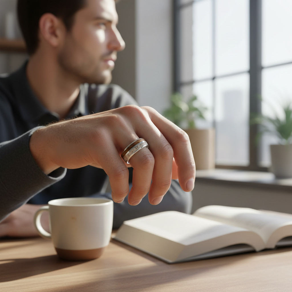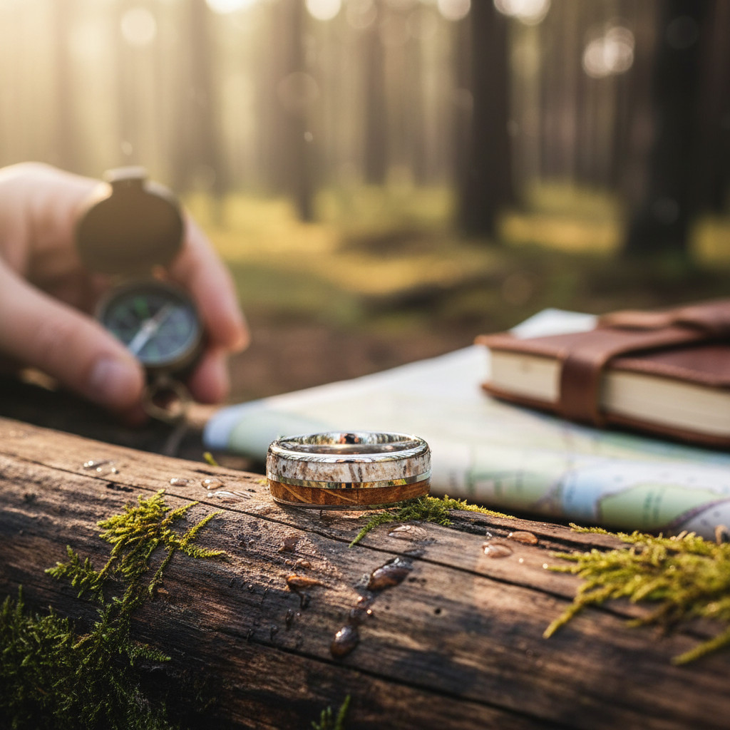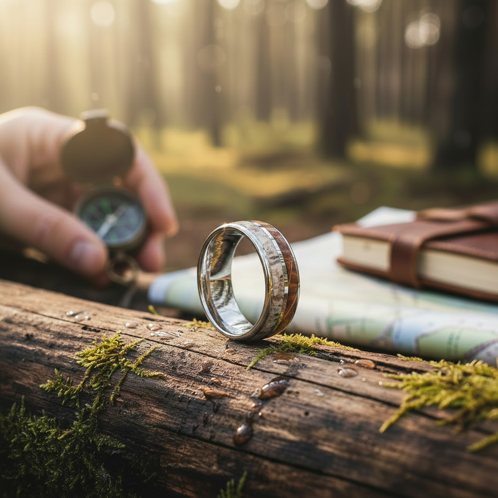 Cette bague marie avec élégance la robustesse du tungstène et la beauté brute des matériaux naturels.